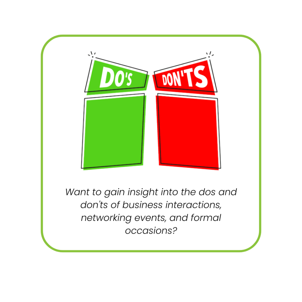 Want to gain insight into the dos and don'ts of business interactions, networking events, and formal occasions?